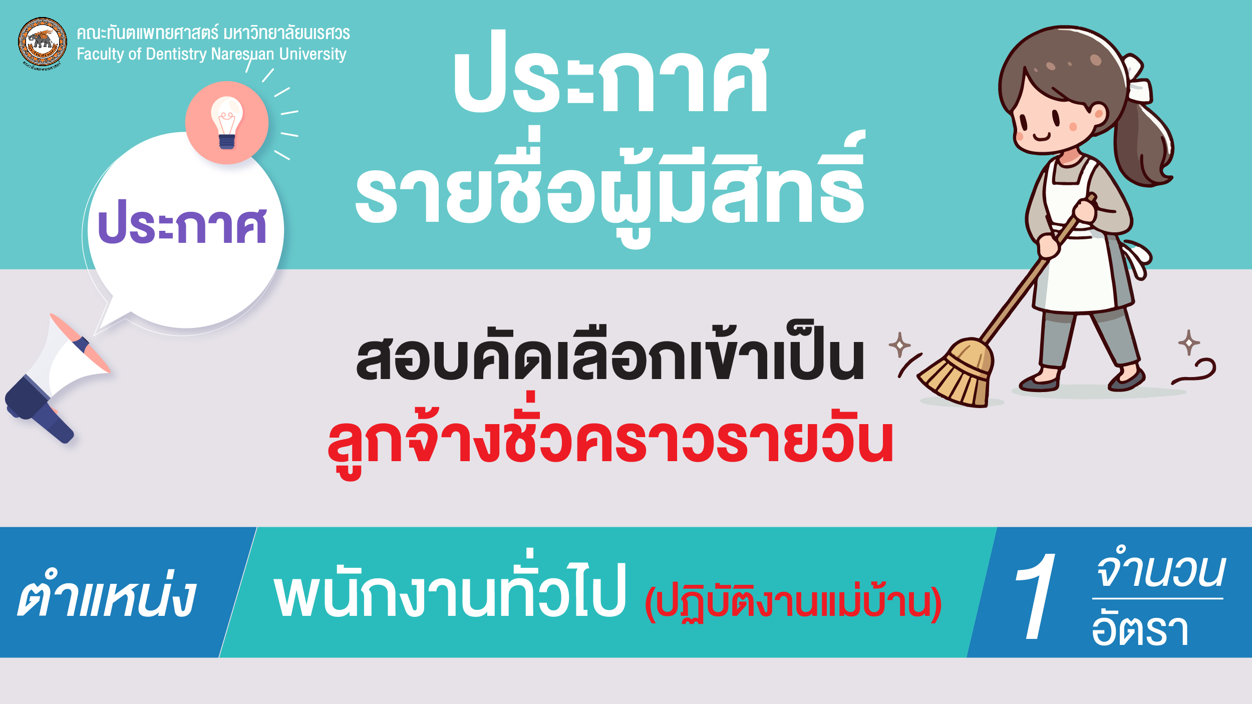 ประกาศรายชื่อผู้มีสิทธิ์สอบคัดเลือกเข้าเป็นลูกจ้างชั่วคราวรายวัน ตำแหน่ง พนักงานทั่วไป (ปฏิบัติงานแม่บ้าน)