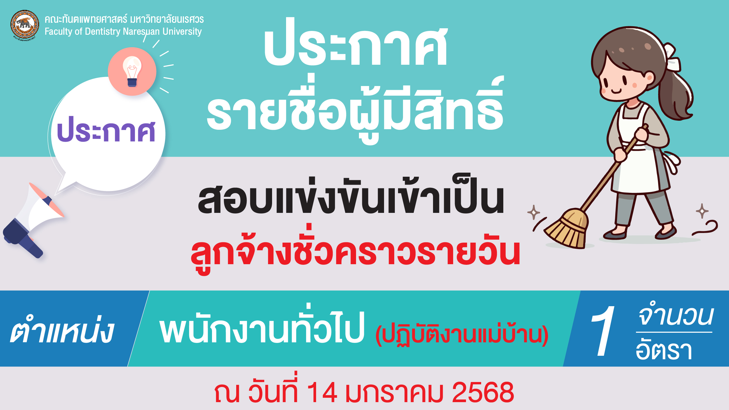 ประกาศคณะทันตแพทยศาสตร์ มหาวิทยาลัยนเรศวร เรื่อง รายชื่อผู้มีสิทธิ์สอบแข่งขันเข้าเป็นลูกจ้างชั่วคราวรายวัน