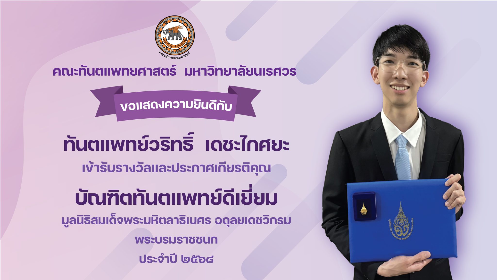 สมเด็จพระกนิษฐาธิราชเจ้า กรมสมเด็จพระเทพรัตนราชสุดาฯ สยามบรมราชกุมารี เนื่องในโอกาสเข้ารับพระราชทานรางวัลและประกาศเกียรติคุณ “บัณฑิตทันตแพทย์ดีเยี่ยม” ประจําปี ๒๕๖๘ ซึ่งจัดโดย มูลนิธิสมเด็จพระมหิตลาธิเบศร อดุลยเดชวิกรม พระบรมราชชนก รางวัลดังกล่าวเป็นรางวัลที่มูลนิธิ สมเด็จพระมหิตลาธิเบศร อดุลยเดชวิกรม พระบรมราชชนก มอบให้กับบัณฑิตดีเด่นยอดเยี่ยม สาขาวิชา แพทยศาสตร์ ทันตแพทยศาสตร์ และเภสัชศาสตร์ที่มีผลการเรียนยอดเยี่ยมของแต่ละสถาบัน และมีคุณสมบัติครบถ้วนตามที่กําหนด เพื่อเป็นกําลังใจแก่บัณฑิตและเป็นแบบอย่างที่ดีให้แก่เยาวชน