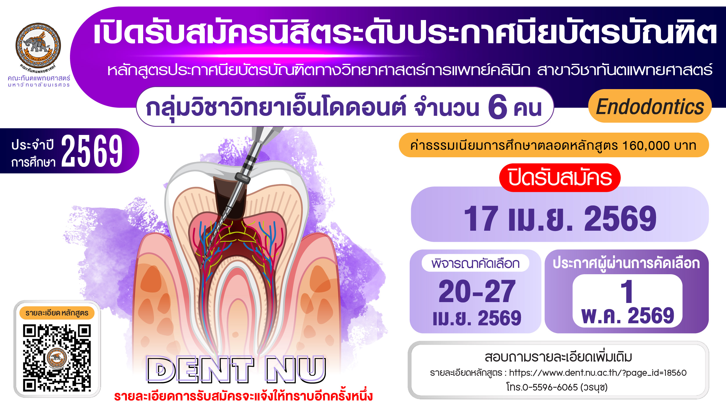 📍คณะทันตแพทยศาสตร์ มหาวิทยาลัยนเรศวร ขอประชาสัมพันธ์การรับสมัครคัดเลือกบุคคลเพื่อเข้าศึกษาหลักสูตรประกาศนียบัตรบัณฑิตทางวิทยาศาสตร์การแพทย์คลินิก สาขาวิชาทันตแพทยศาสตร์ กลุ่มวิชาวิทยาเอ็นโดดอนต์ ประจำปีการศึกษา 2569📍