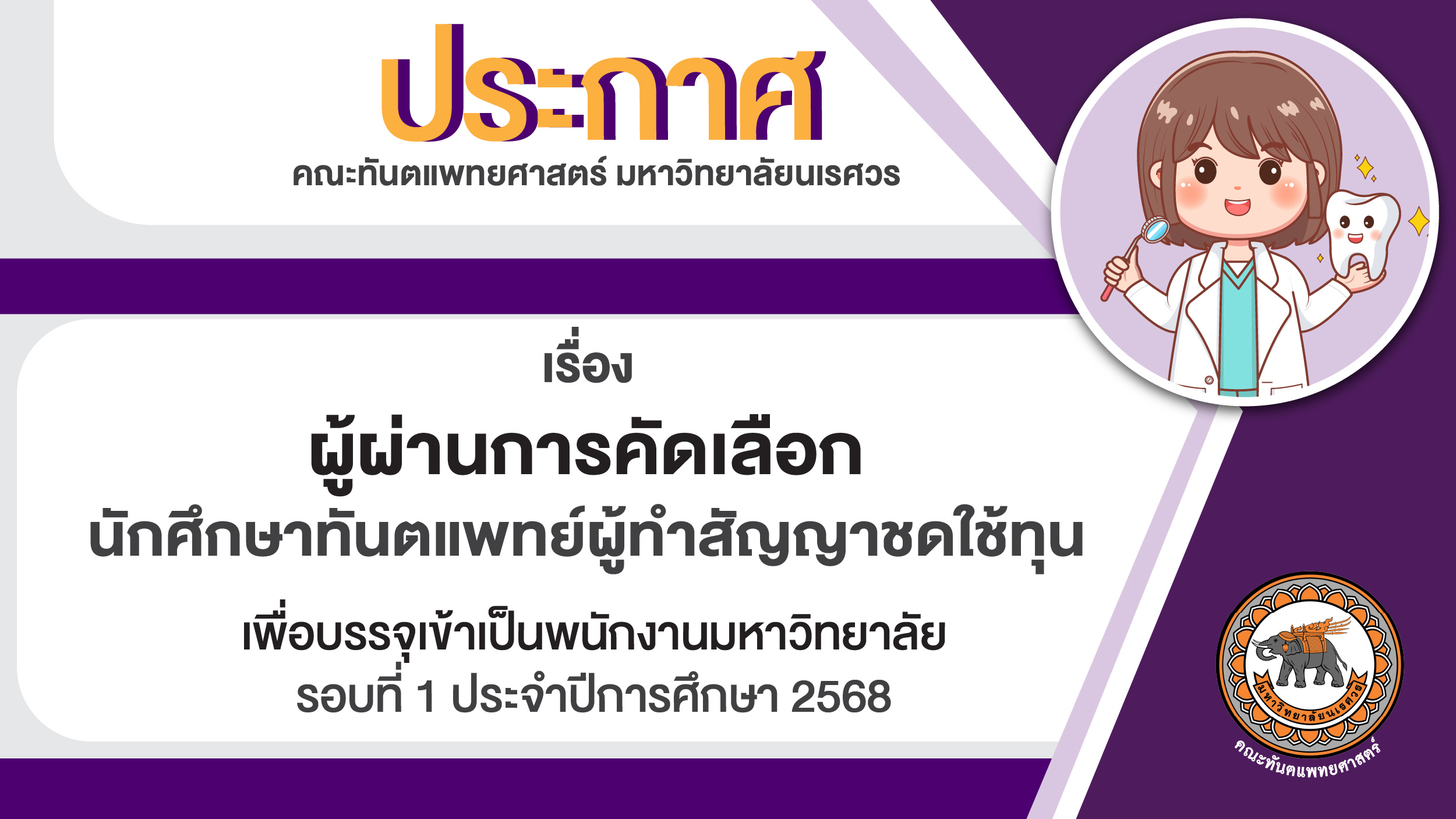 ประกาศคณะทันตแพทยศาสตร์ มหาวิทยาลัยนเรศวร เรื่องผู้ผ่านการคัดเลือกนักศึกษาทันตแพทย์ผู้ทำสัญญาชดใช้ทุน เพื่อคัดเลือกบรรจุ