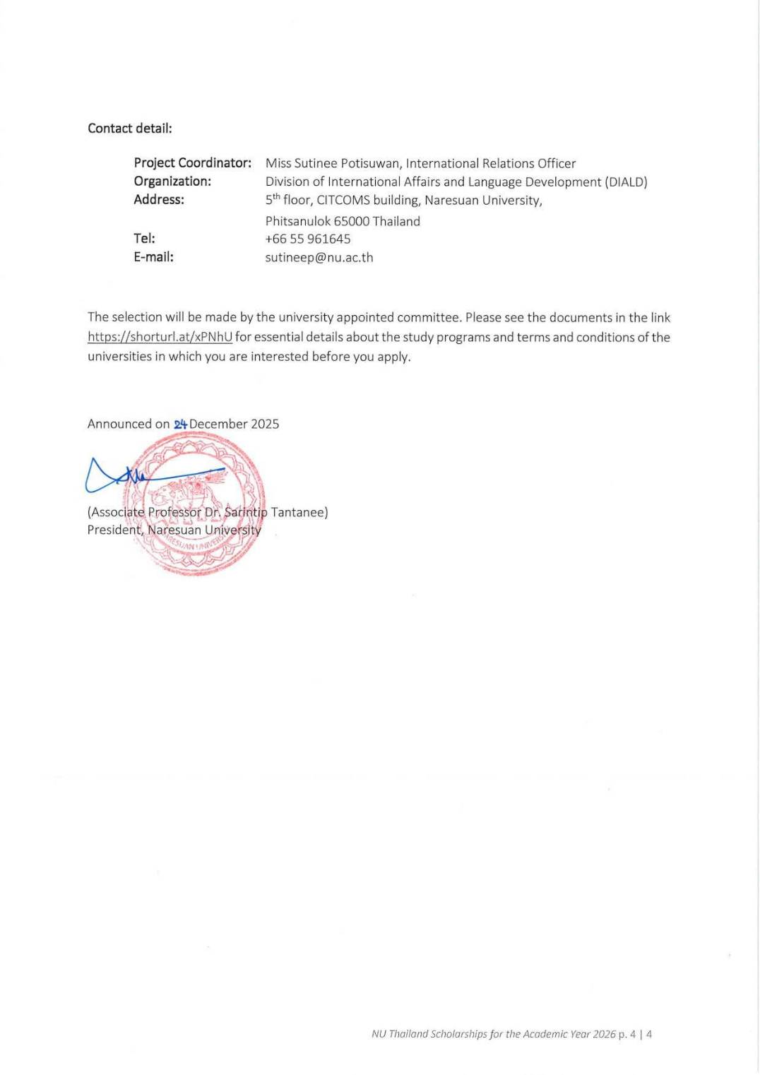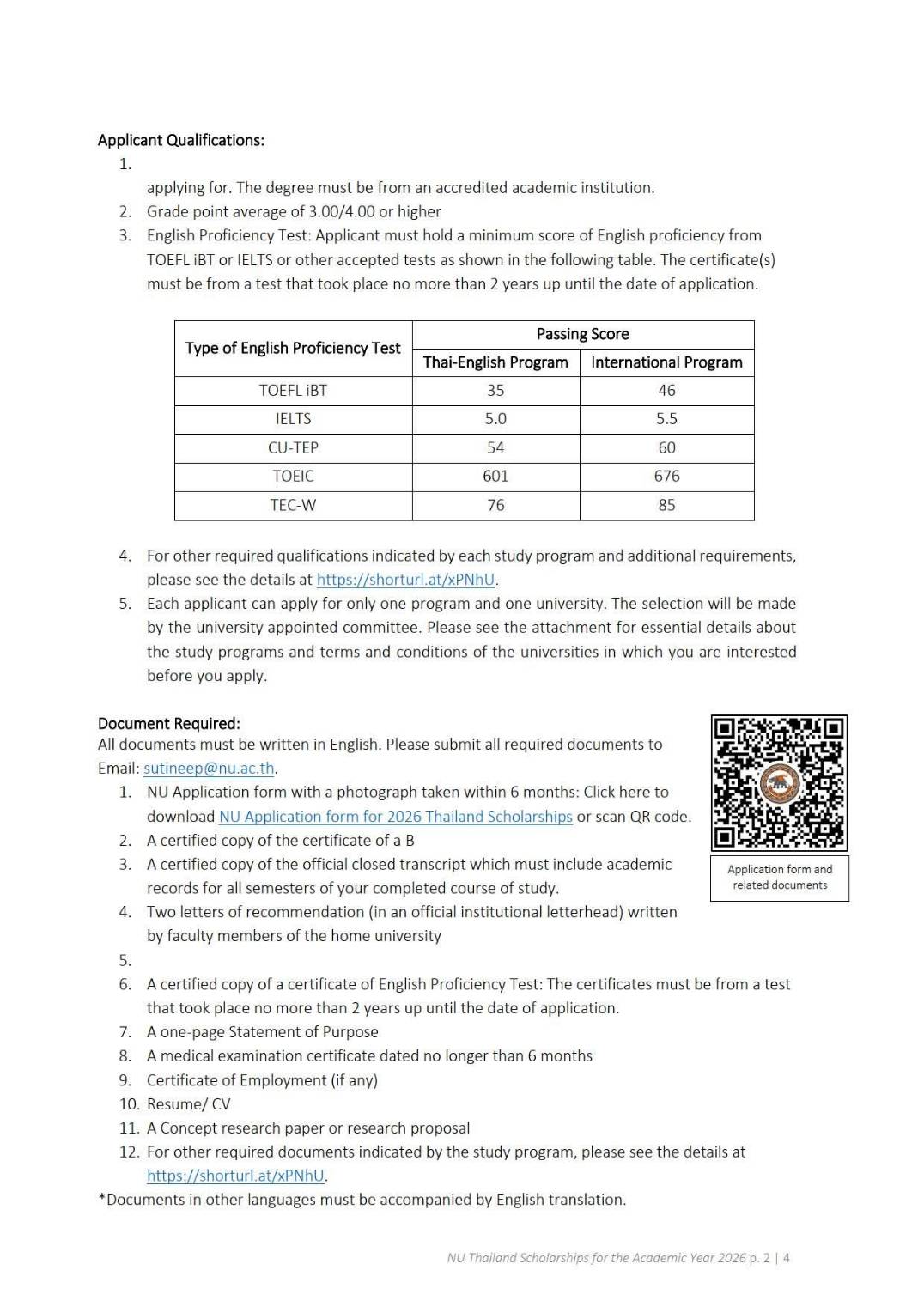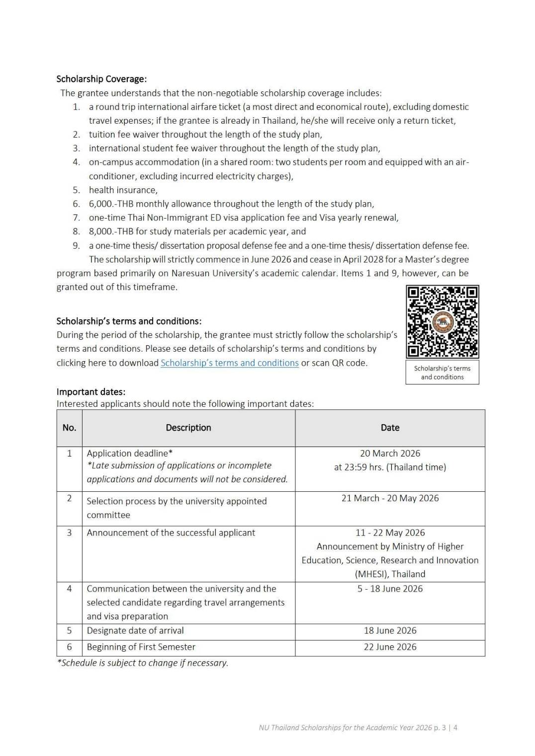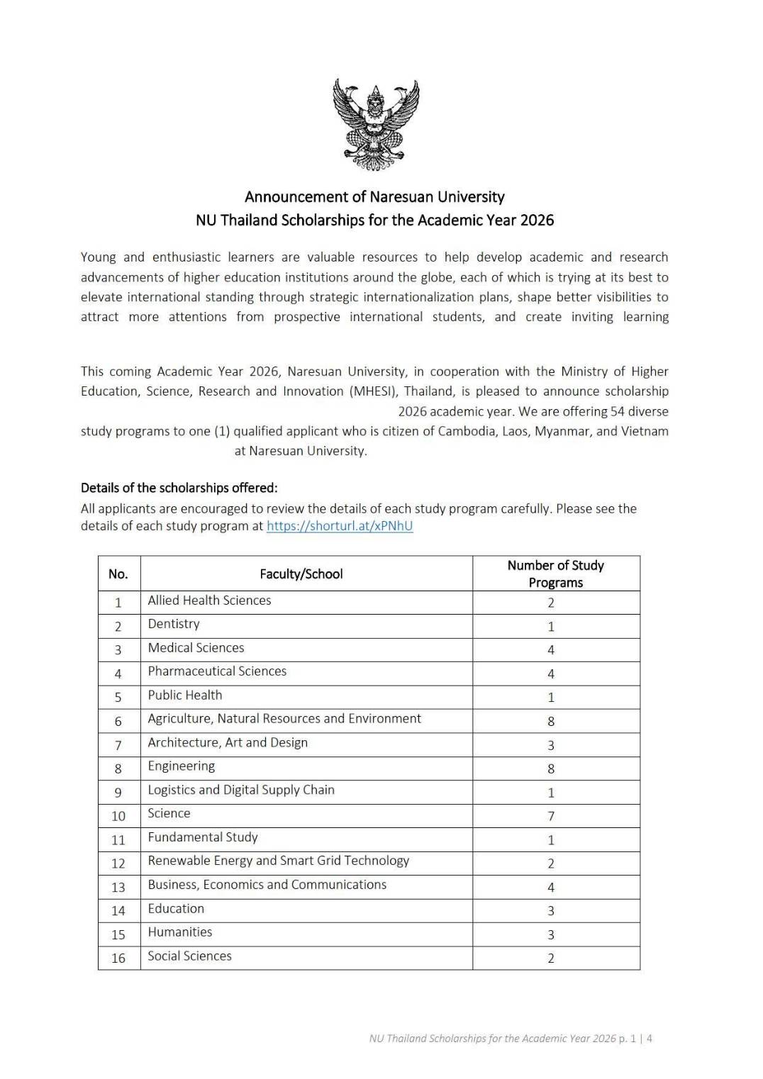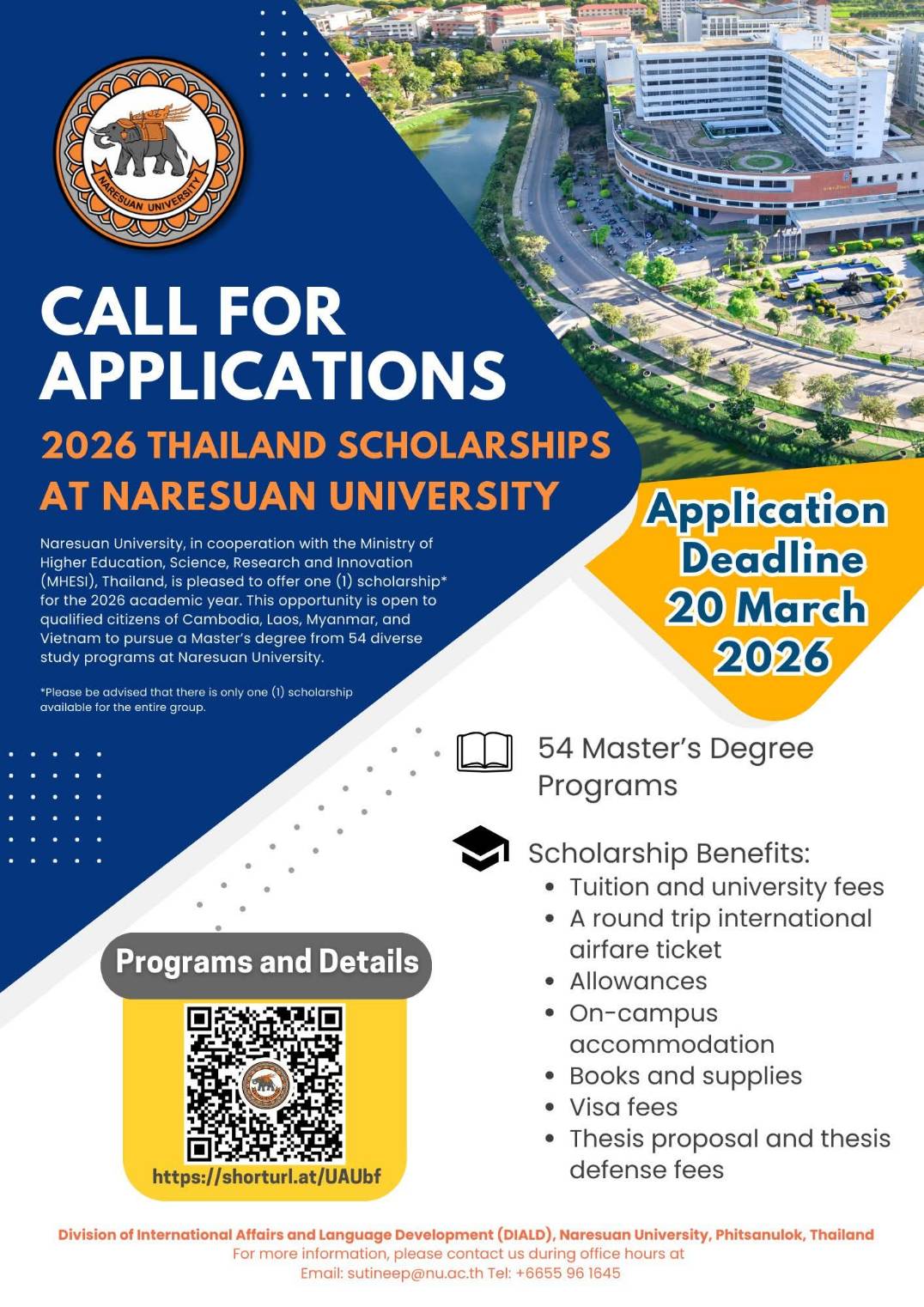 ðĒCall for ApplicationsðĢNaresuan University, in cooperation with the Ministry of Higher Education, Science, Research and Innovation (MHESI), Thailand, is pleased to announce scholarship opportunities for our Masterâs degree programs for the 2026 academic year. We are offering 54 diverse study programs to one (1) qualified applicant who is a citizen of Cambodia, Laos, Myanmar, and Vietnam to pursue masterâs degree at Naresuan University. Please see the documents in the link https://shorturl.at/UAUbf