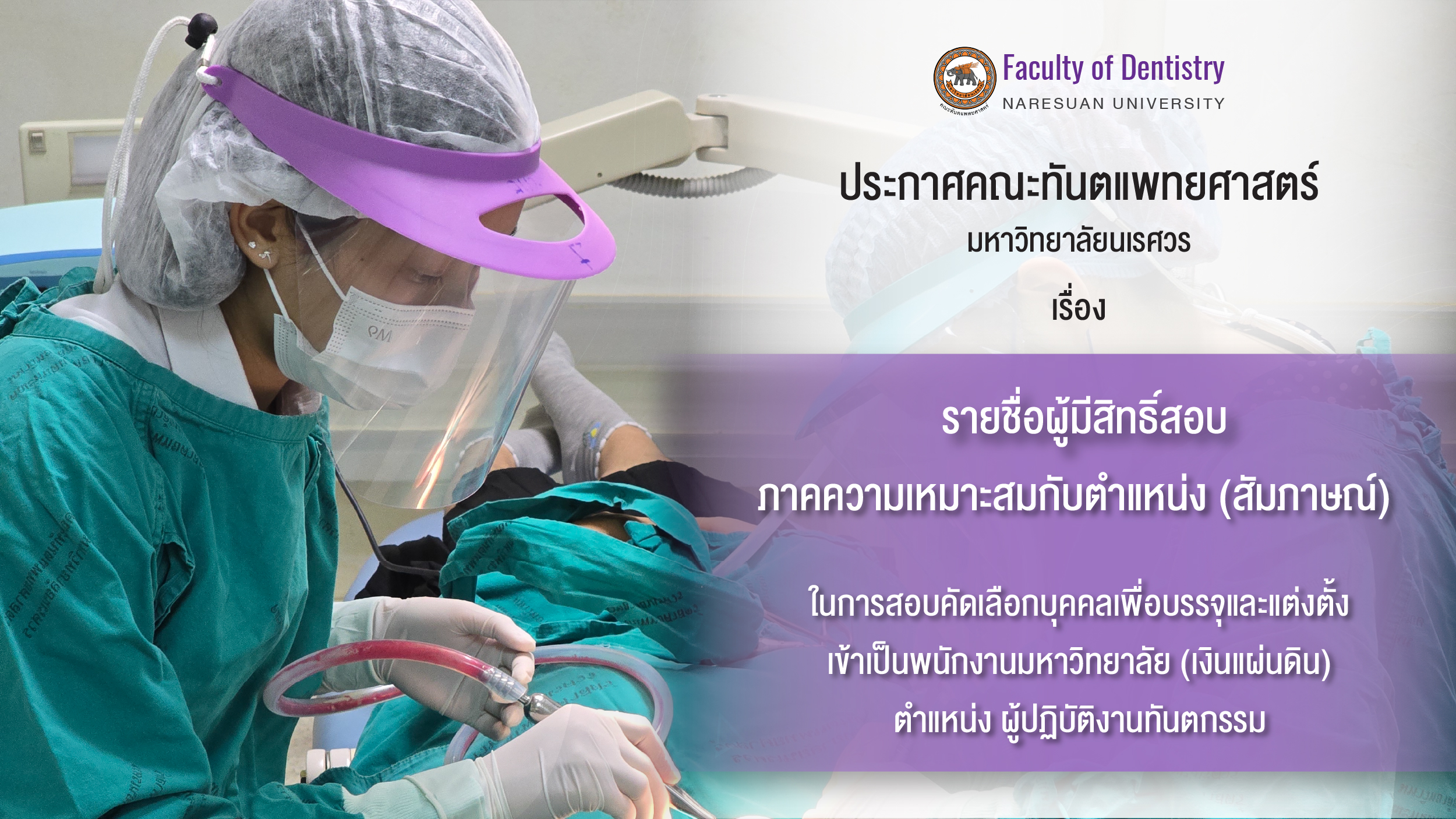ประกาศคณะทันตแพทยศาสตร์ มหาวิทยาลัยนเรศวร เรื่อง รายชื่อผู้มีสิทธิ์สอบภาคความเหมาะสมกับตำแหน่ง (สัมภาษณ์) ในการสอบคัดเลือกบุคคลเพื่อบรรจุและแต่งตั้งเข้าเป็นพนักงานมหาวิทยาลัย (เงินแผ่นดิน)