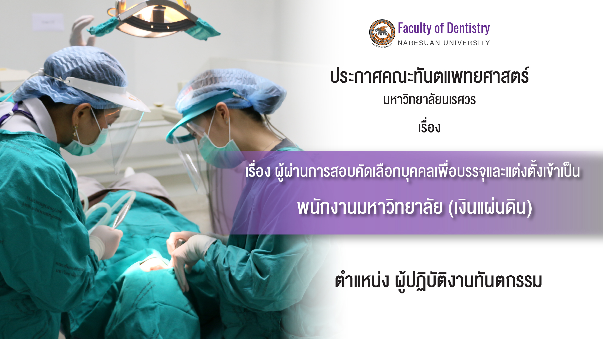 ประกาศคณะทันตแพทยศาสตร์ มหาวิทยาลัยนเรศวร เรื่อง ผู้ผ่านการสอบคัดเลือกบุคคลเพื่อบรรจุและแต่งตั้งเข้าเป็นพนักงานมหาวิทยาลัย (เงินแผ่นดิน) ตำแหน่ง ผู้ปฏิบัติงานทันตกรรม