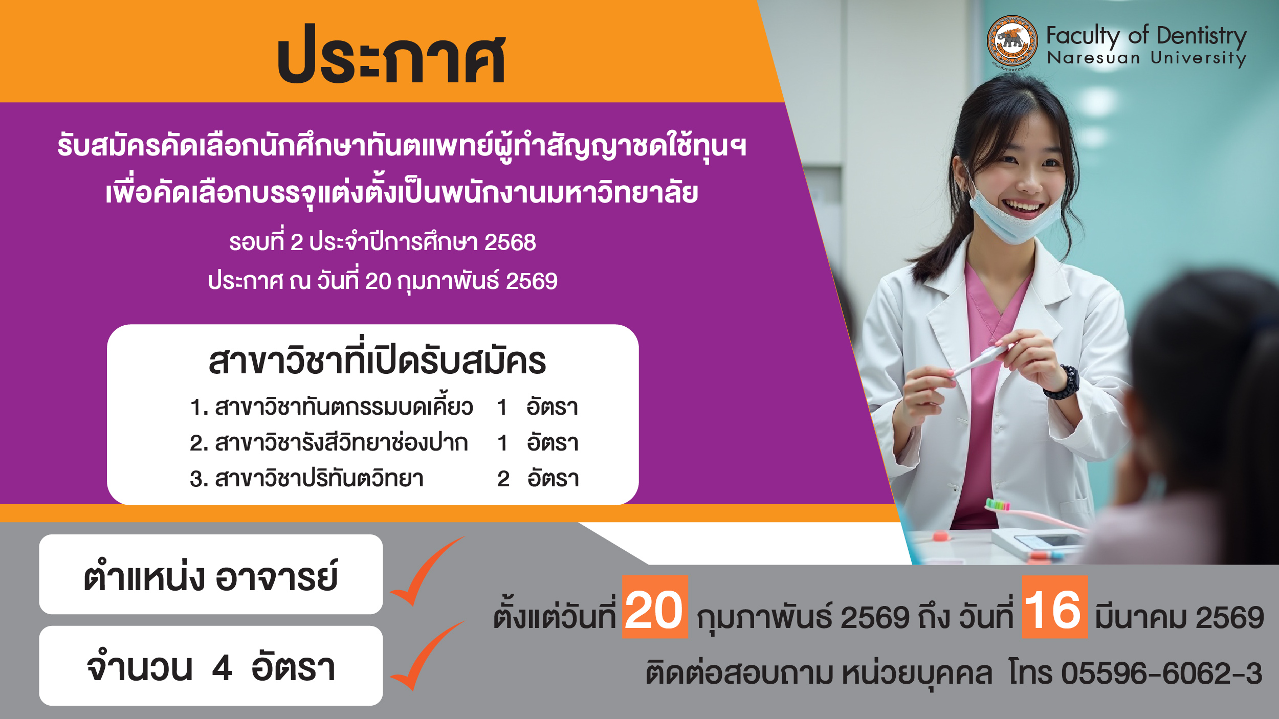 ประกาศคณะทันตแพทยศาสตร์ มหาวิทยาลัยนเรศวร รับสมัครคัดเลือกนักศึกษาทันตแพทย์ผู้ทำสัญญาชดใช้ทุนฯ เพื่อคัดเลือกบรรจุแต่งตั้งเป็นพนักงานมหาวิทยาลัย รอบที่ 2