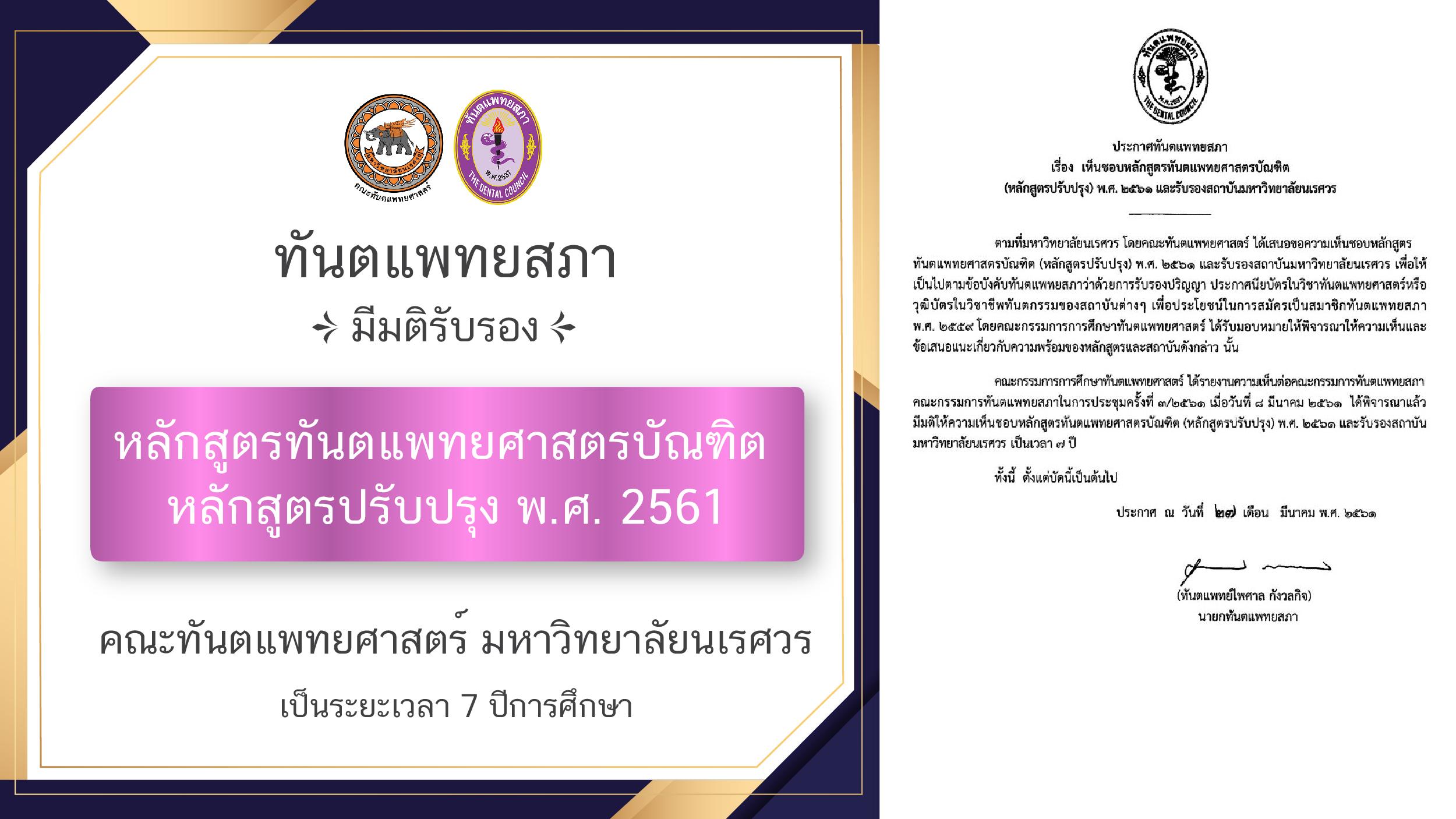 • ทันตแพทยสภา ให้ความเห็นชอบหลักสูตร ในการประชุมครั้งที่ 3/2561 เมื่อวันที่ 8 มีนาคม 2561